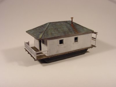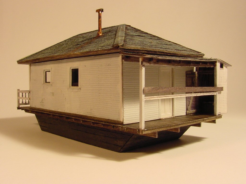 The scale is 1:87 HO. Overall dimensions are 33' x 16' not counting the not-so-out-outhouse. Roof is Campbell shingles on a solid wood core. Walls are hand-scribed Strathmore on a basswood core. Windows are real (damn thin) glass. Floor is board-by-board scale 1x4s.