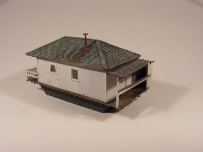 The scale is 1:87 HO. Overall dimensions are 33' x 16' not counting the not-so-out-outhouse. Roof is Campbell shingles on a solid wood core. Walls are hand-scribed Strathmore on a basswood core. Windows are real (damn thin) glass. Floor is board-by-board scale 1x4s.