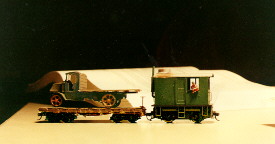 This is a picture of an HOn3 Grandt Line Boxcab diesel engine pulling a Puffing Billy 24' flatcar loaded with a Jordan Mack truck. I use Kadee N scale couplers on my equipment. The boxcab has a Details Associates F-unit roof fan and an Athearn freightliner exhaust stack. The Puffing Billy line is out of business as far as I know. Too bad really since these white-metal cars really tracked well. The flatcar has Grandt Line D&RGW short wheelbase trucks and a Westinghouse brake kit. The diesel is painted Floquil "BN Green" with a grimy black frame and rusted silver roof. All the models were weathered by spaying lightly with PollyS "dust".